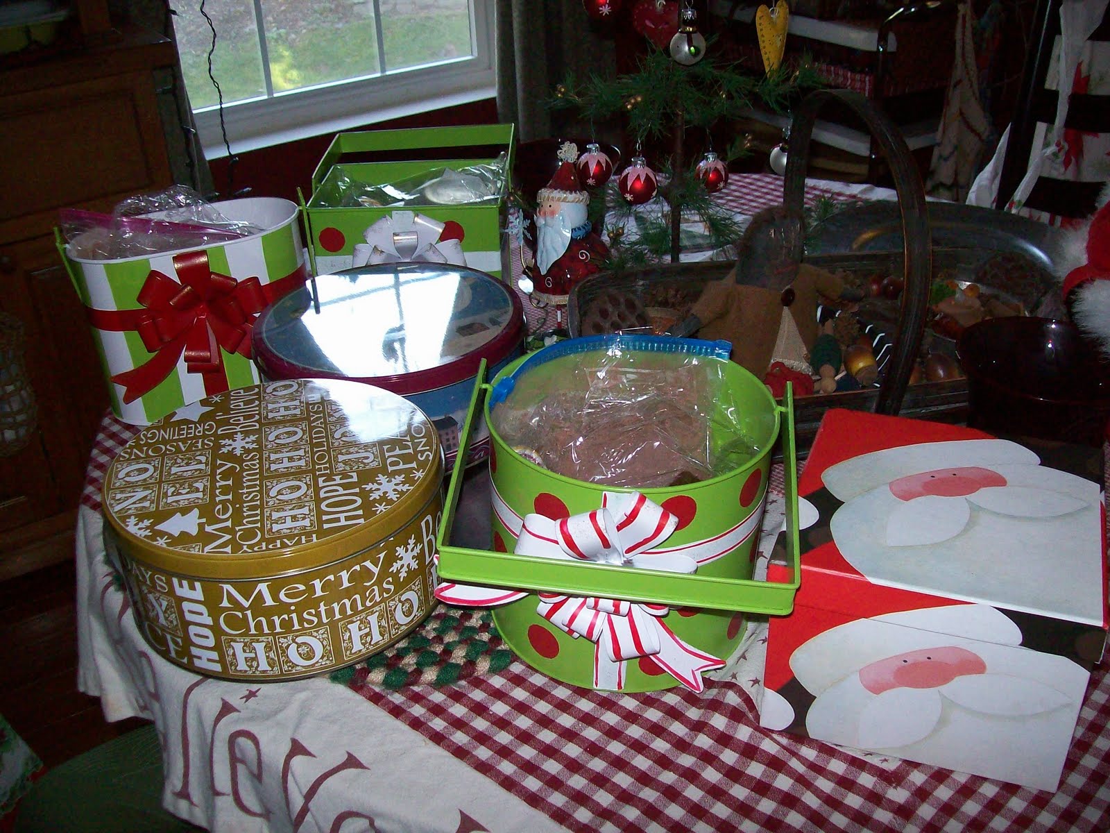 speaking of delivering goodies..this is what I took to church yesterday for some folks;) so far I have made snickerdoodles, everything but the kitchen sink cookies, fudge, chocolate cherry cookies, and I have sugar cookies, gingerbread cookies, brownies and creamcheese/oreo cookies rolled in balls and dipped in chocolate left to make..oh they are soooo good..you take one package of oreo cookies put them in a food processor and take one room temp package (8oz) cream cheese..put it in the processor and mix together..roll in little balls and dip in bittersweet or milk chocolate..put in fridge to harden..oh you will love them..and they will disappear quickly too.;) I got these cute little containers at the after christmas sales at joanns and Michaels and I am ready to go for next year.;)don't you love those green buckets..;) I also put in my homemade hot cocoa too.;)